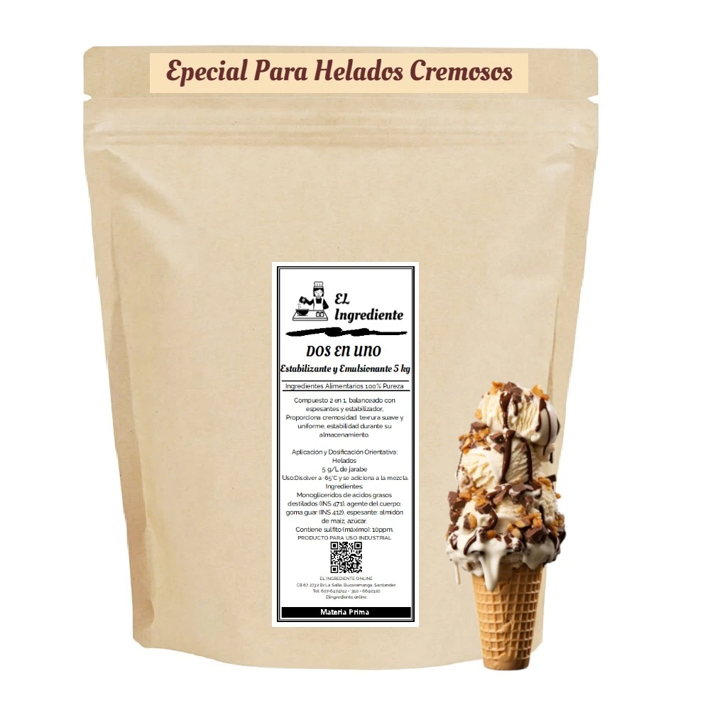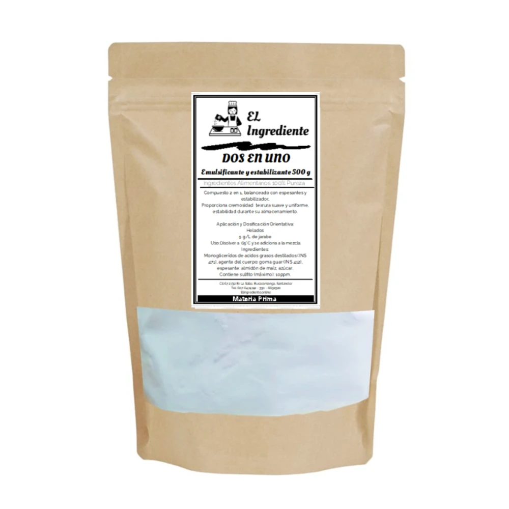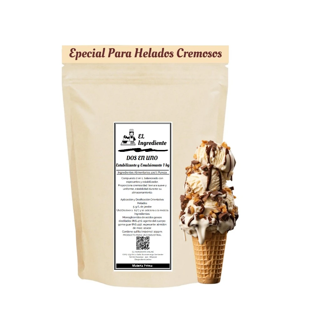 Es un producto dos en uno, trae emulsificante y estabilizante, si deseas un helado con mejor overun este es el ideal, su presentación es en polvo, ideal para proporcionar homogeneidad, estabilidad, garantizando un producto mejor textura, retardando
